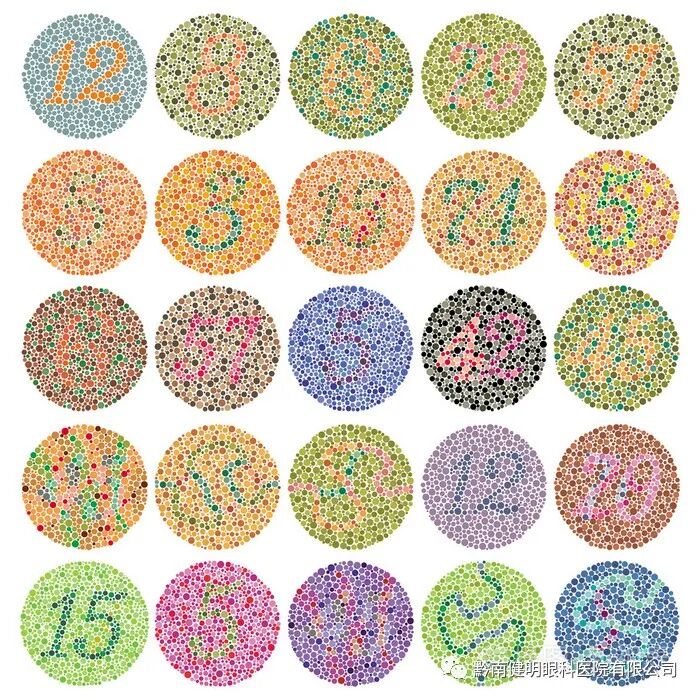 绿色盲患者容易将中红色与中绿色混淆;蓝绿色与灰色、中粉色混淆;鲜绿色与黄色混淆;浅粉色与浅灰色混淆。